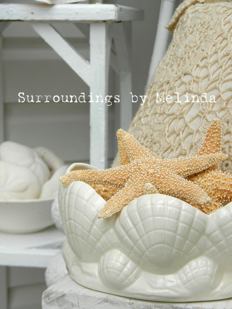 Melinda..your shop looks so warm and inviting. I love the French doors, sea pretties, fresh linens and that lovely parasol. Best Wishes on 20 years in business!